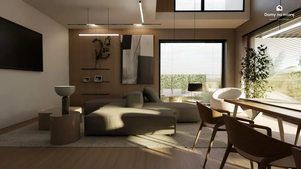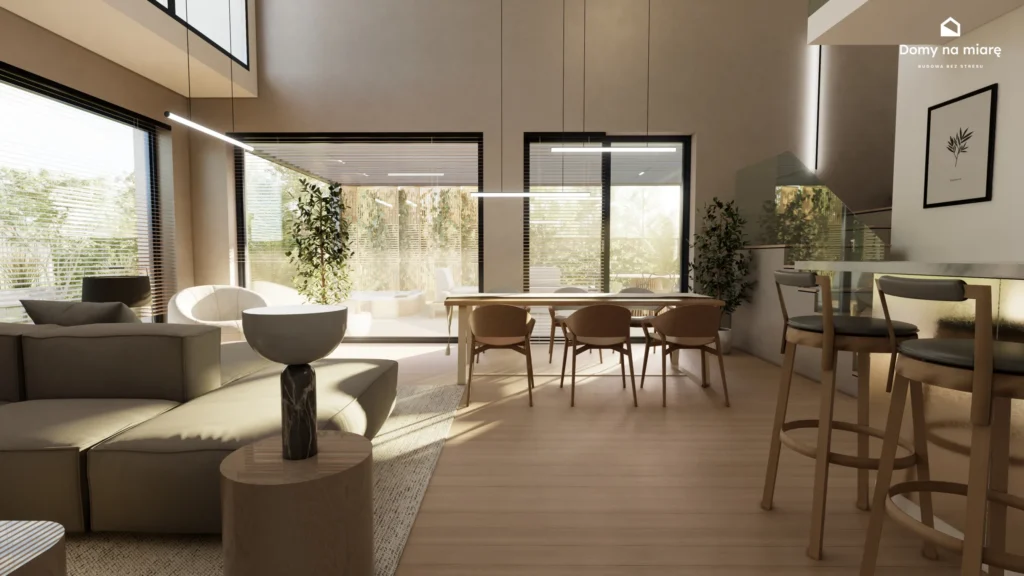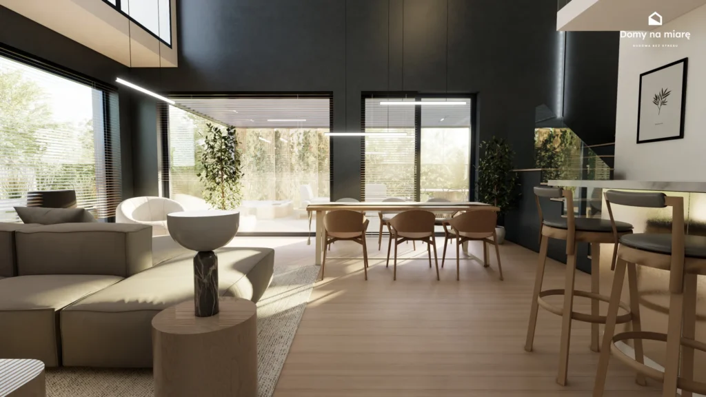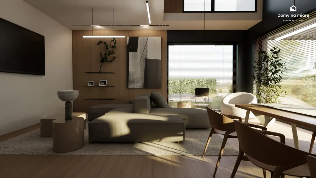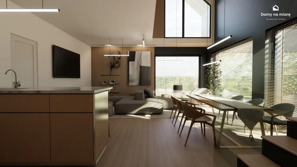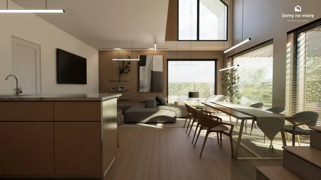 Przestronny salon z wysokim sufitem i widokiem na ogród – idealne miejsce na wspólne chwile z najbliższymi. Trapezowe okna doskonale doświetlają przestrzeń i robią wrażenie