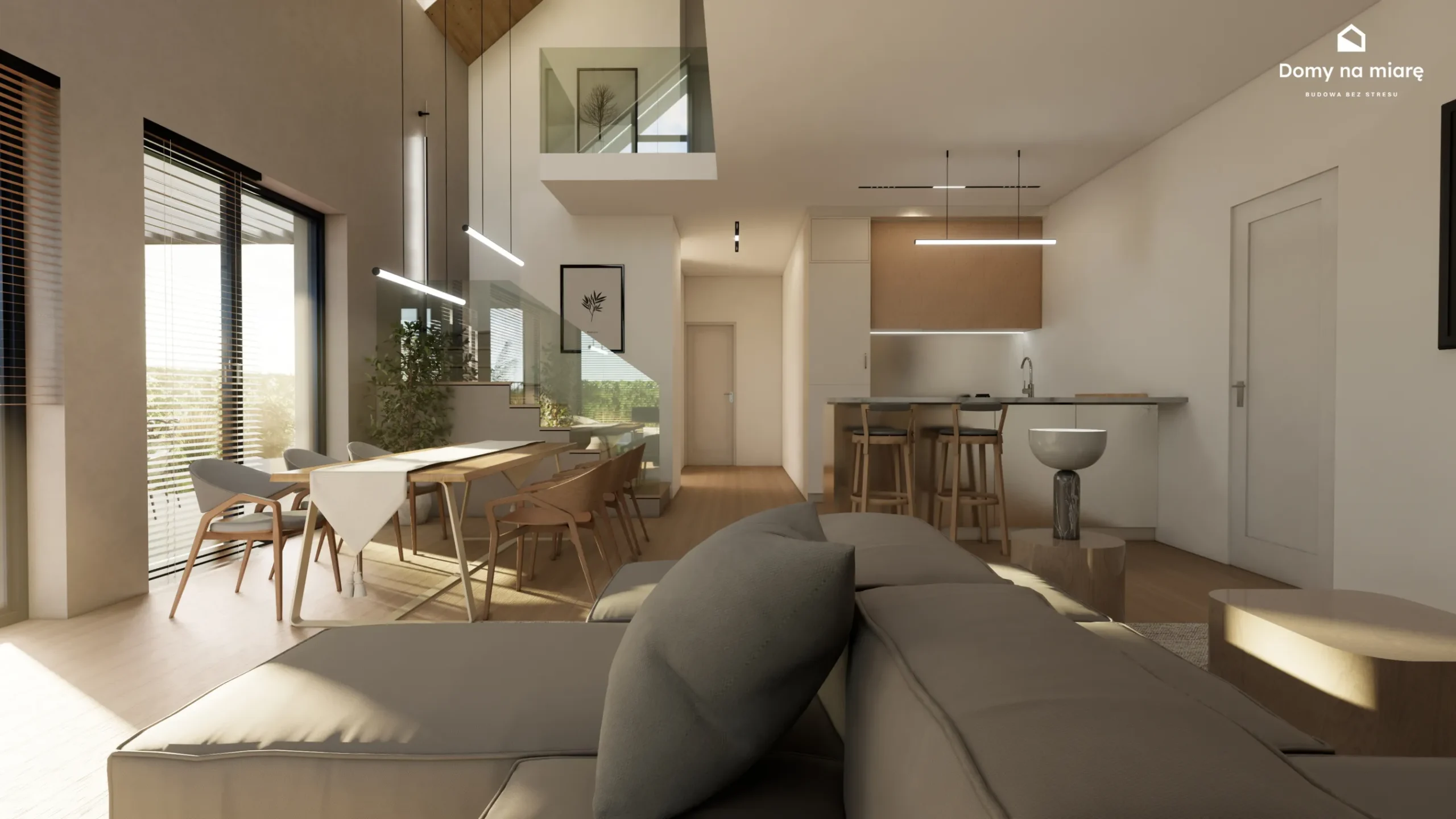 Parter to część dzienna – do wspólnego spędzania czasu oraz pracy, natomiast poddasze jest strefą ciszy – to tutaj znajdują się sypialnie, garderoba oraz druga łazienka.