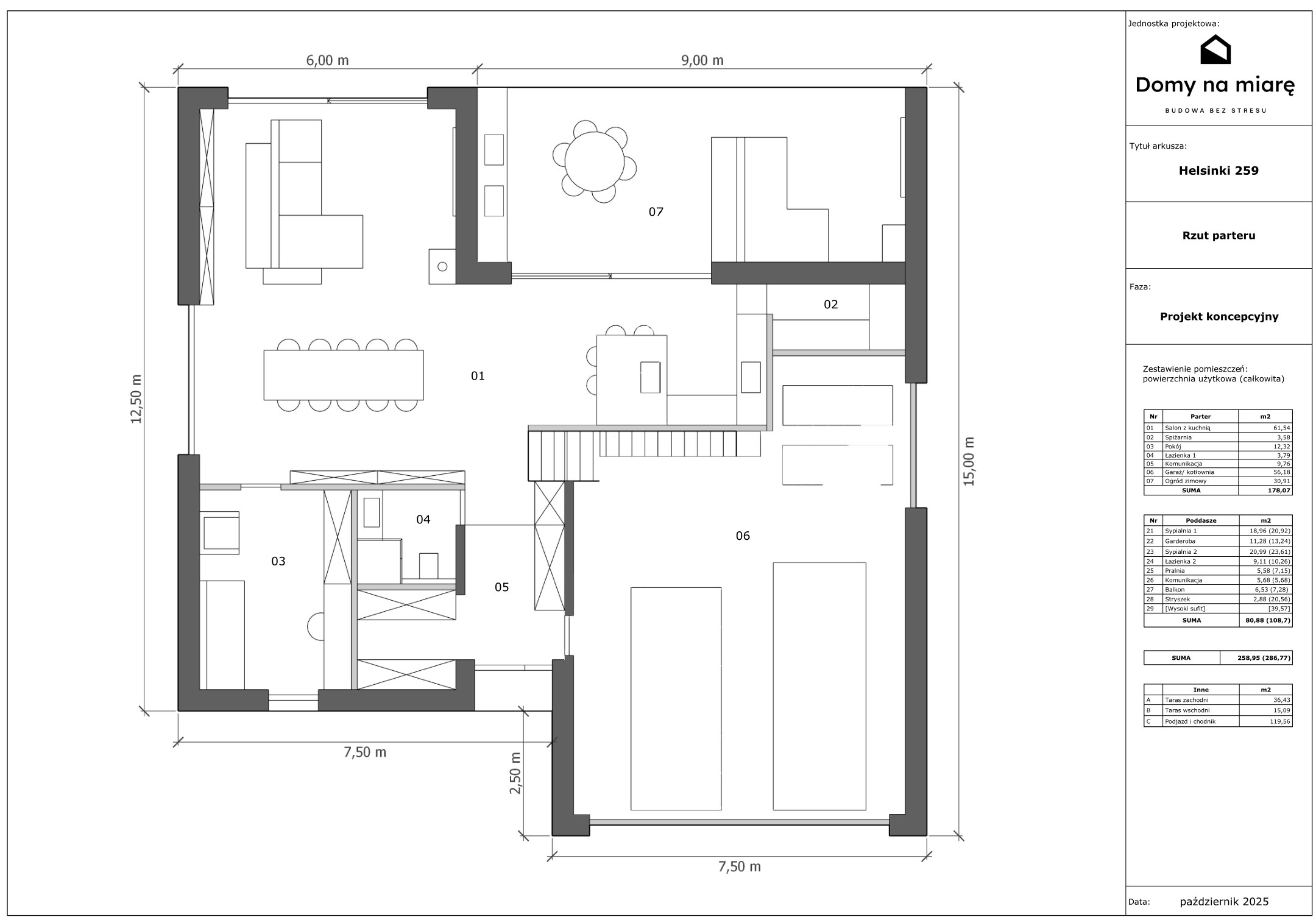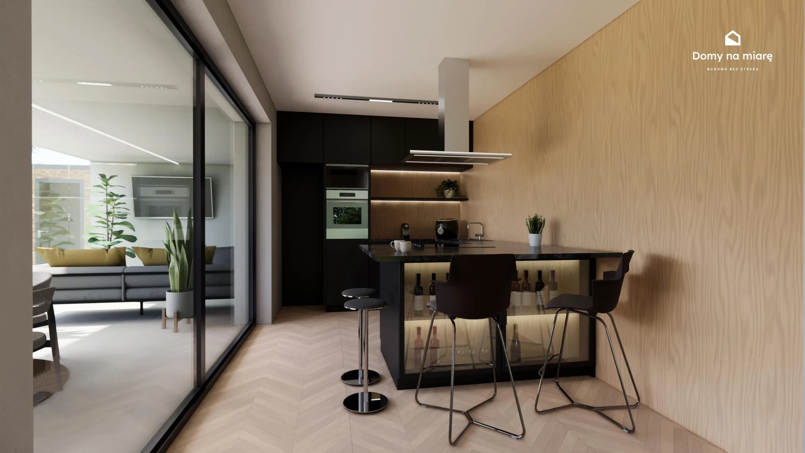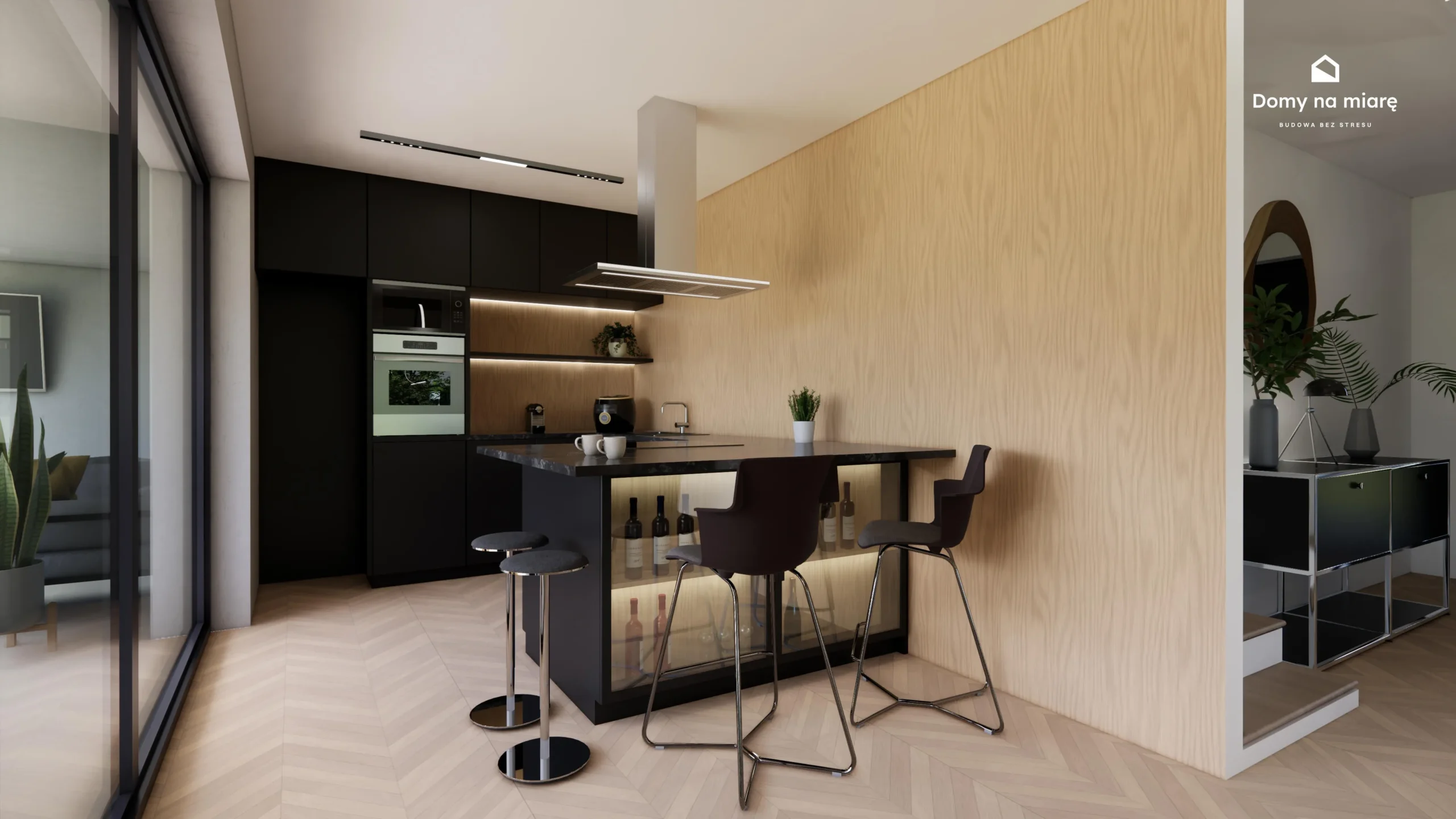 HELSINKI 259 to dom z bardzo jasnym podziałem na strefy. W mniejszym budynku mieści się część dzienna z wysokim salonem oraz jadalnią – serce domu oraz pokój do pracy. Większy budynek z poddaszem to część prywatna – na parterze zaprojektowano wydzieloną kuchnię ze spiżarnią, ogród zimowy z dodatkową kuchnią letnią idealną na spotkania z najbliższymi i wspólne gotowanie. Na poddaszu znajdują się dwie przestronne sypialnie, duża garderoba, druga łazienka pralnia i balkon.