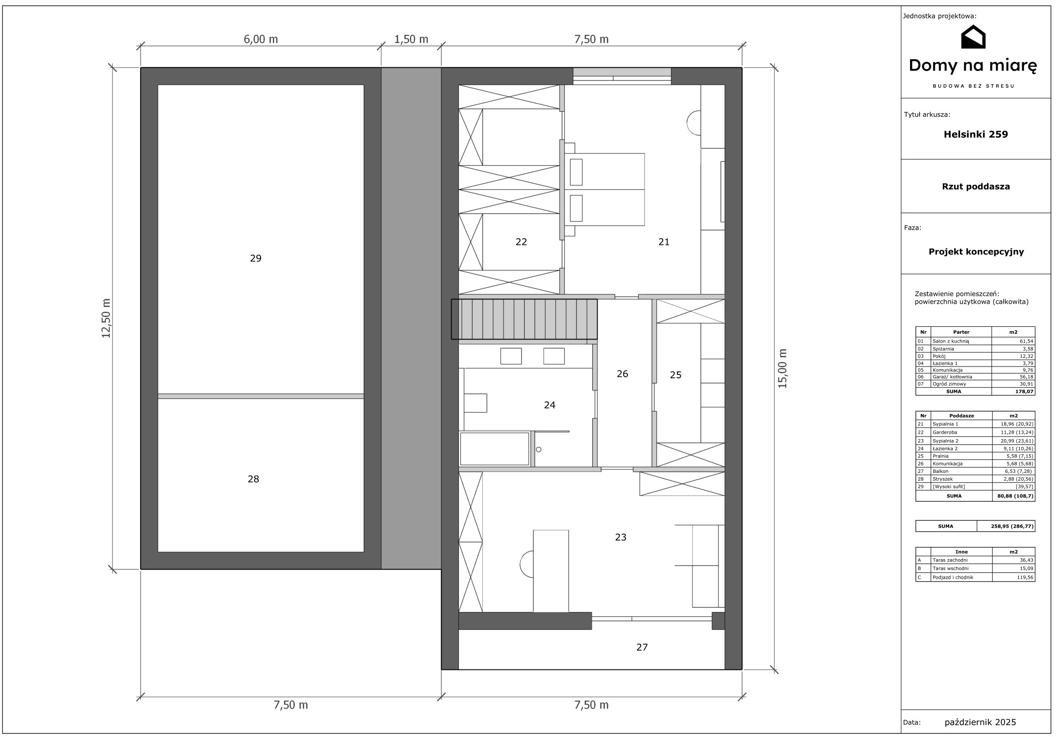 Znajdziesz tu szczegółowe informacje o wymiarach zewnętrznych budynku i wielkości jego pomieszczeń.