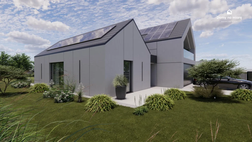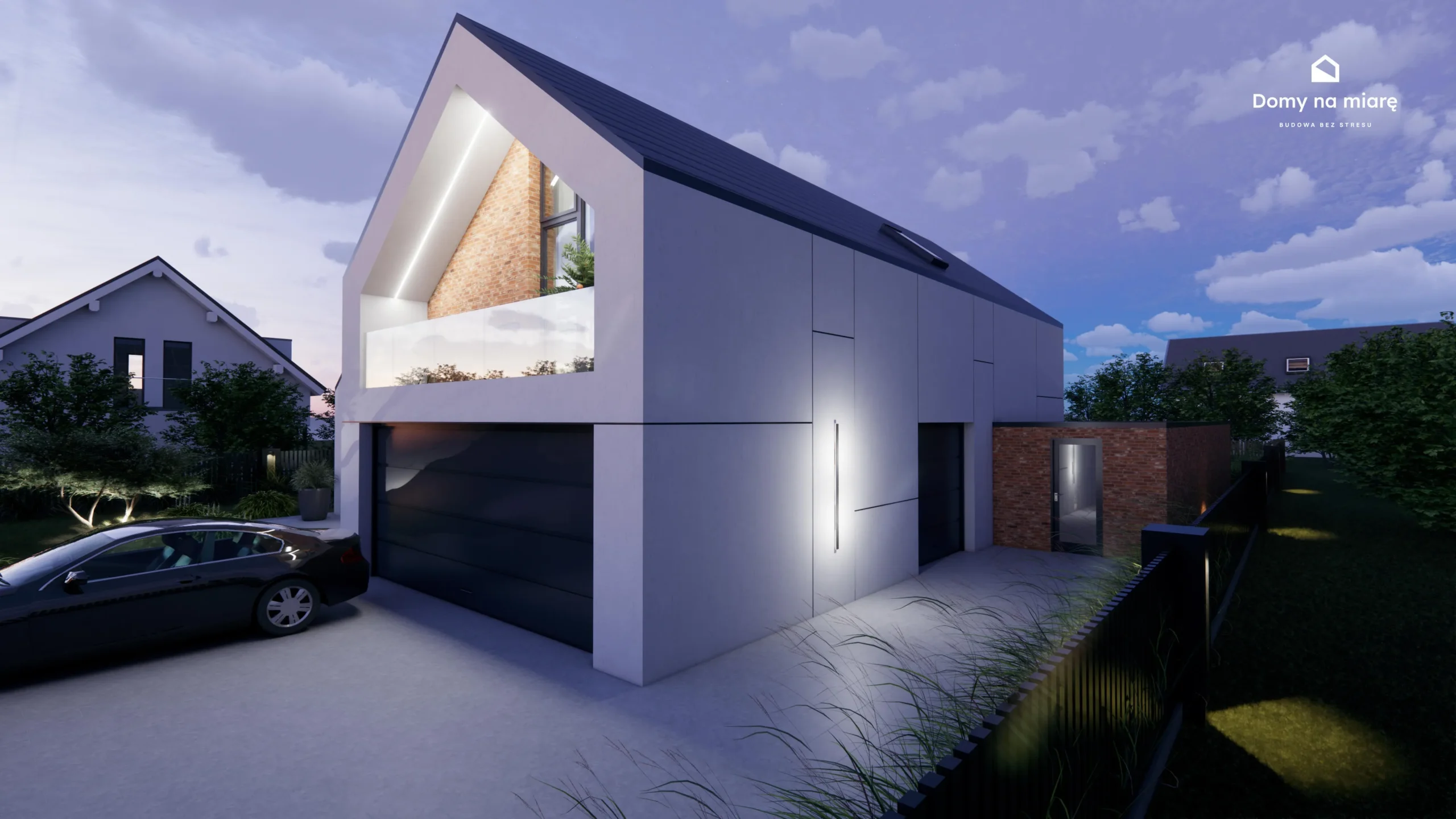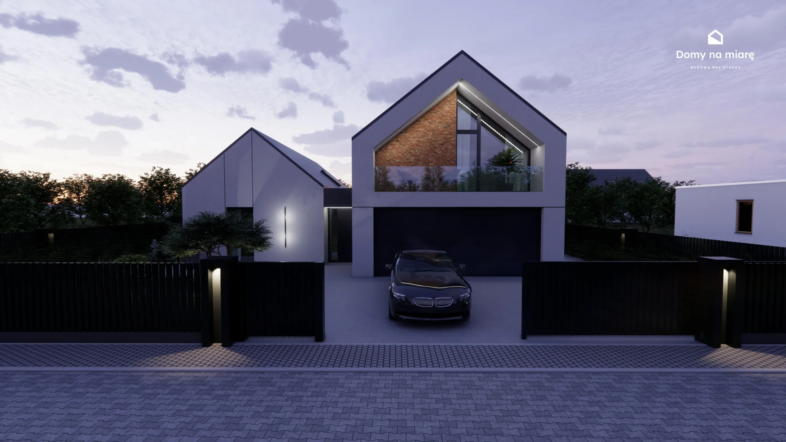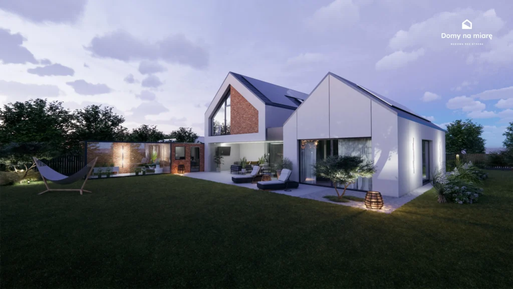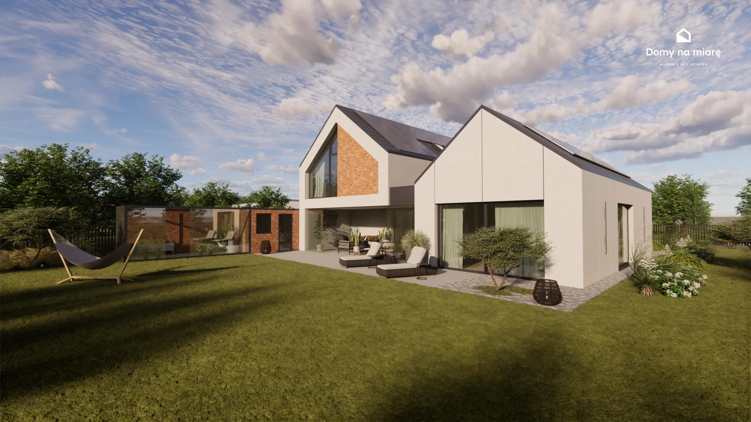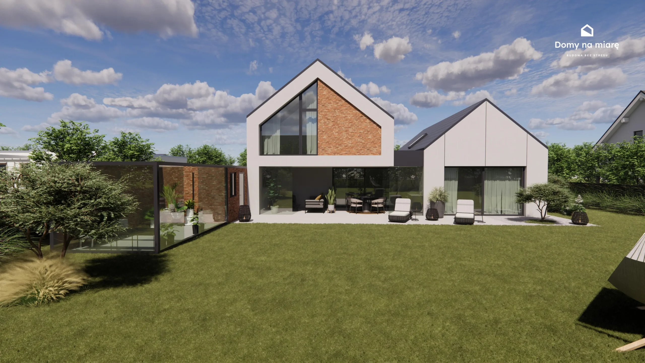Zabudowę działki uzupełnia strefa relaksu z ogrodem zimowym, paleniskiem oraz basenem zewnętrznym.