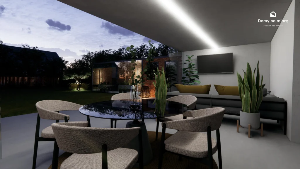 Właścicielom zależało na możliwości miejscu wspólnych spotkań z najbliższymi – ogród zimowy z dodatkową letnią kuchnią to idealne miejsce na takie okazje.