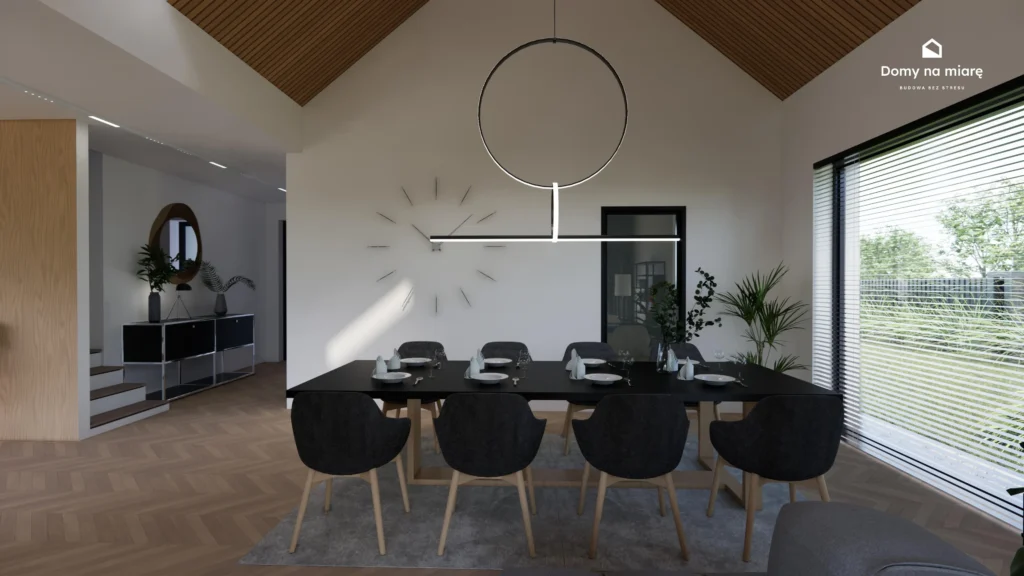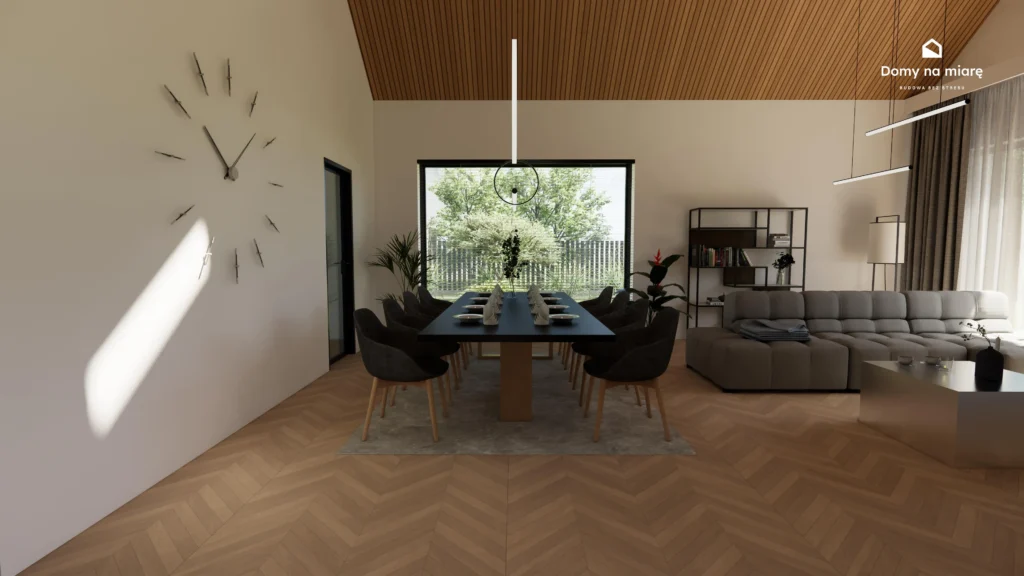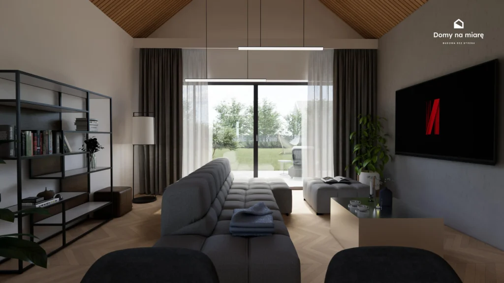 Przestronny salon z wysokim sufitem i widokiem na ogród – idealne miejsce na wspólne chwile z najbliższymi.
