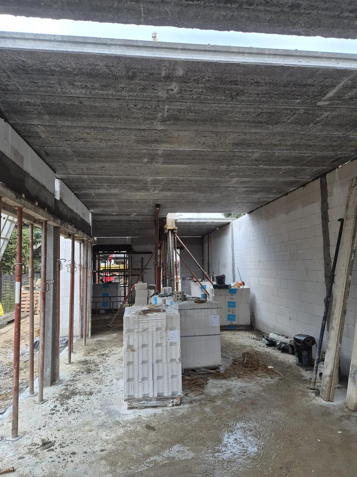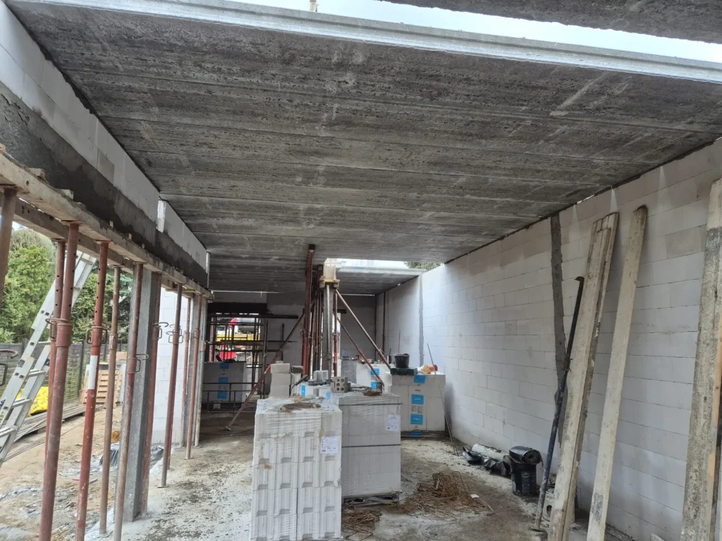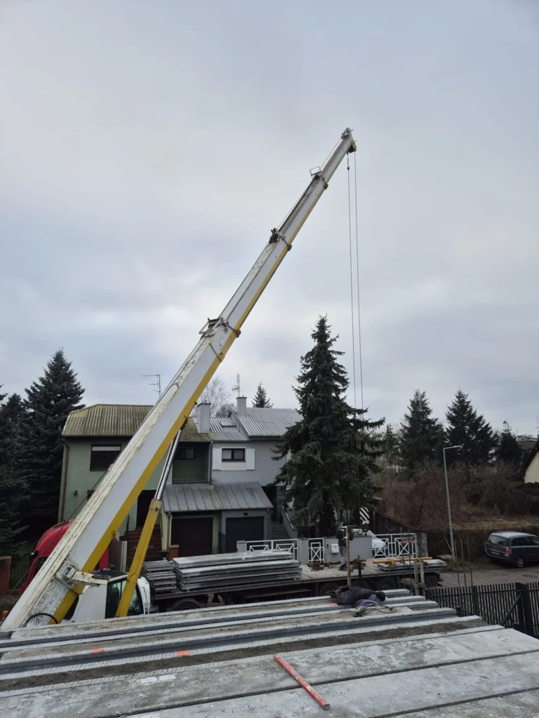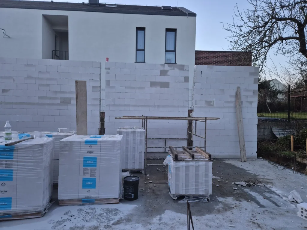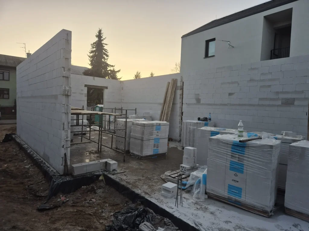 W Poznaniu trwa budowa domu Oslo o powierzchni 170 m2. Nasz klient zakupił wąską działkę w miejskiej zabudowie, dopasowaliśmy projekt tak, aby wpisywał się w wymagania działki oraz miejscowego planu. Budynek został postawiony na ławie płycie fundamentowej z uwagi na warunki gruntowe. Ściany nośne wykonane zostały z silikatów. Zastosowaliśmy strop prefabrykowany. Kolejnym etapem będzie murowanie ścian piętra, konstrukcja i pokrycie dachu.