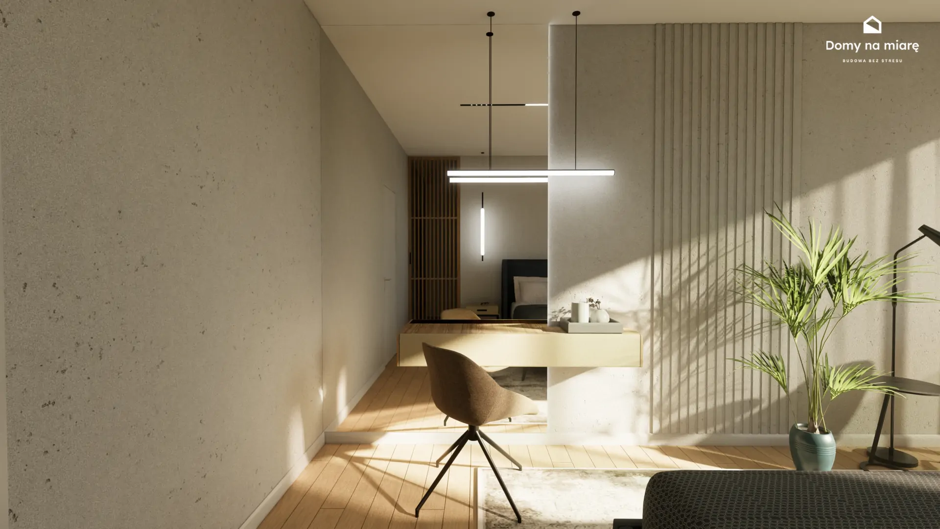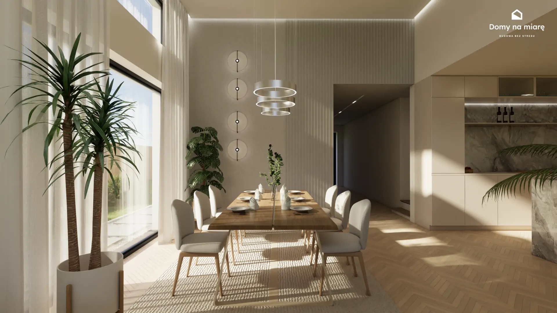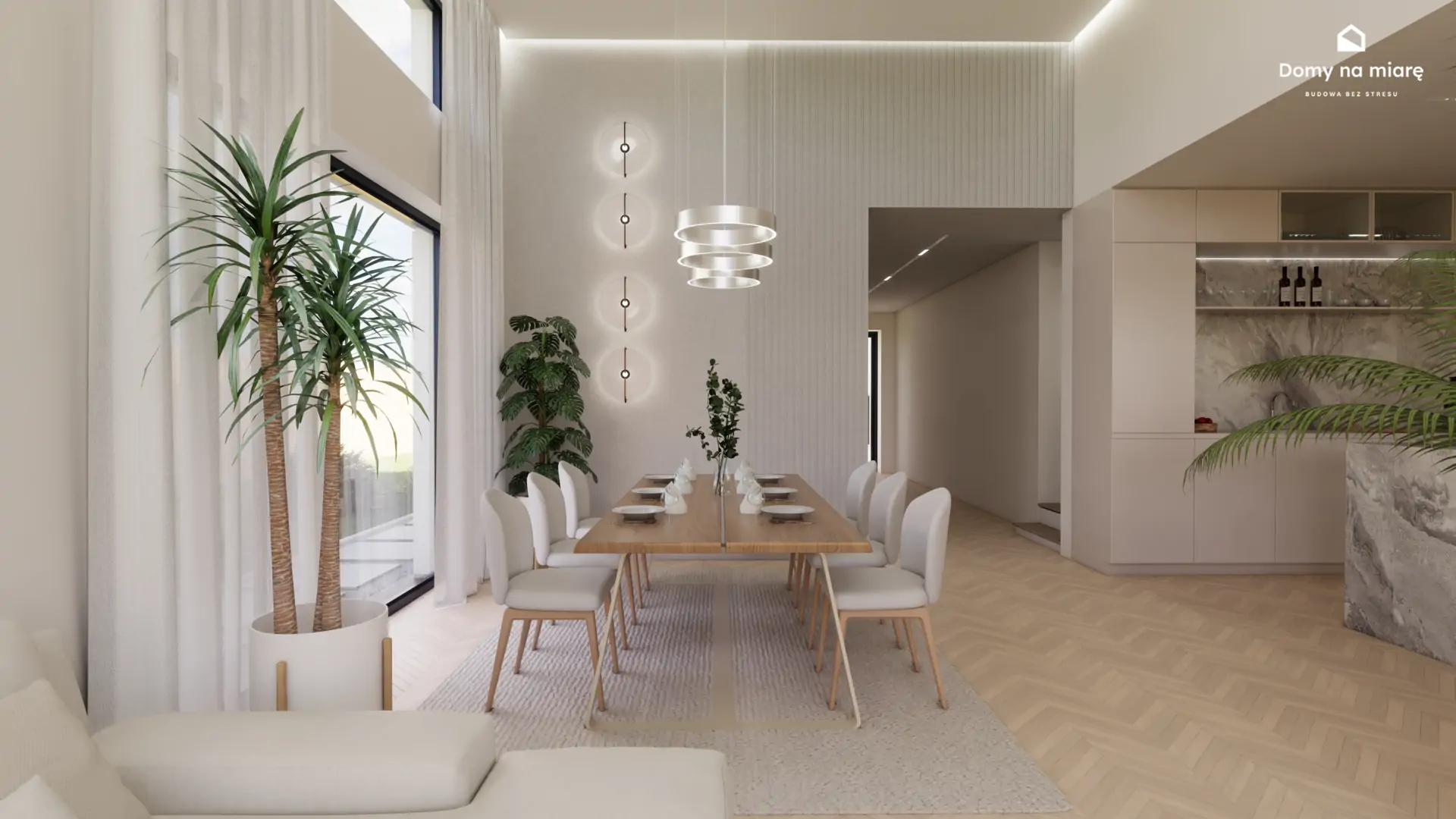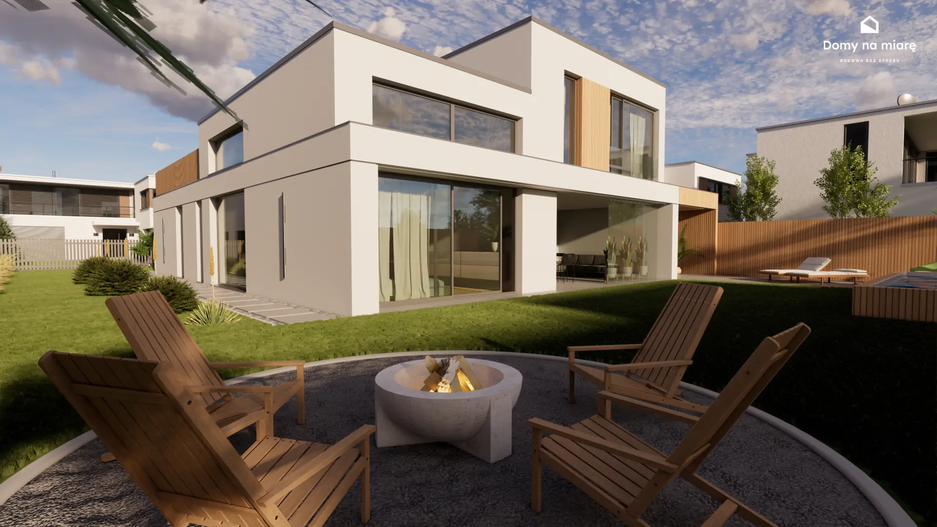 To dom z bardzo jasnym podziałem na strefę dzienną oraz nocną z osobnym wydzielonym apartamentem, w którym znajduje się główna sypialnia z łazienką i przestronną garderobą. Centralną część domu stanowi salon z częściowo wydzieloną kuchnią i jadalnią. Z kuchni prowadzi przejście do części wypoczynkowej, gdzie znajduje się jacuzzi zewnętrzne. Duże przeszklenia zapewniają doskonałe doświetlenie oraz widok na ogród. W domu zaprojektowano 2 stanowiskowy garaż, a na piętrze dodatkowy taras z wyjściem z sypialni.