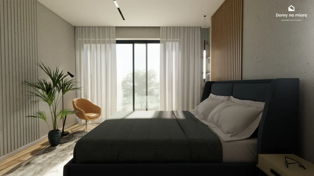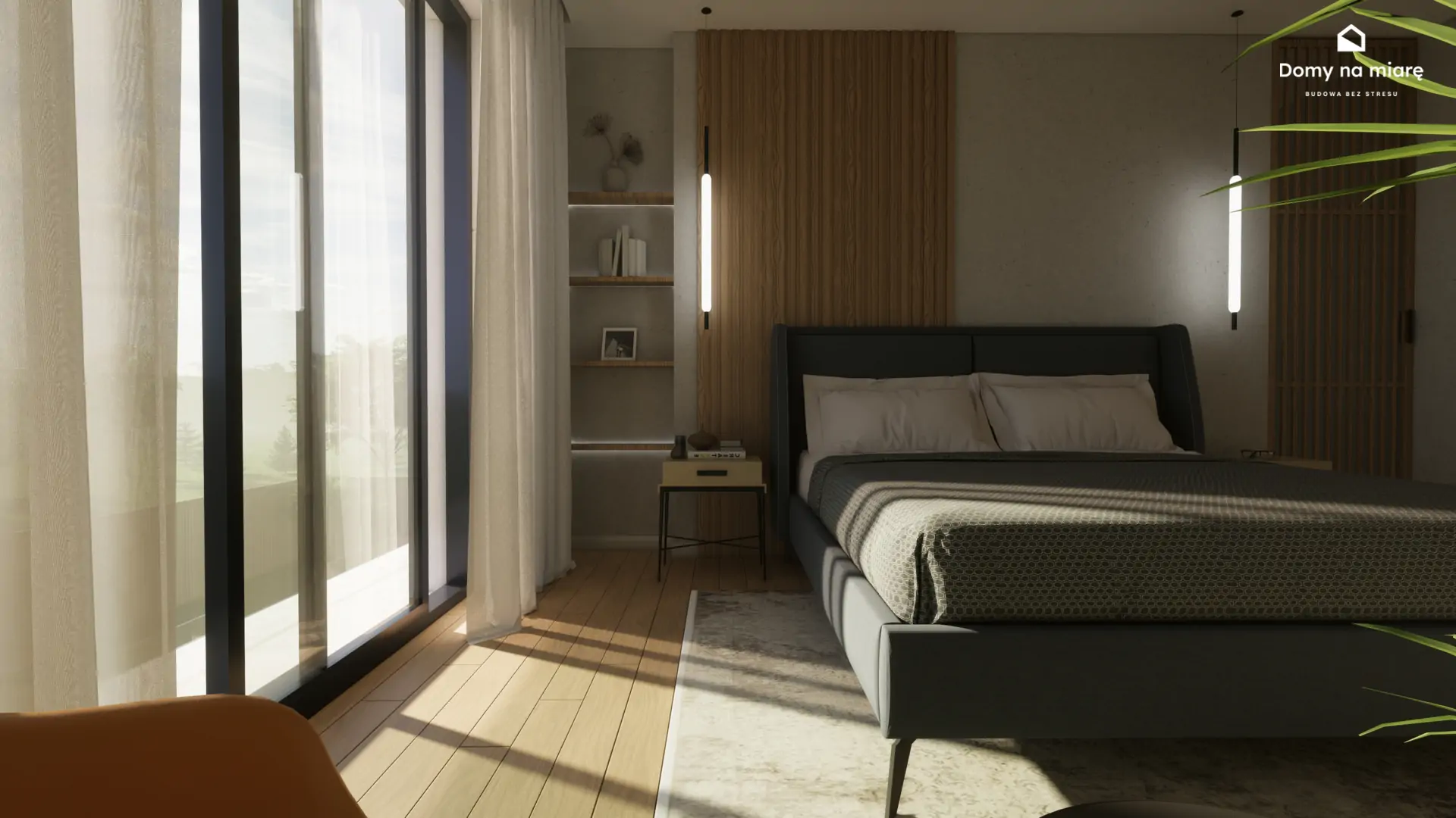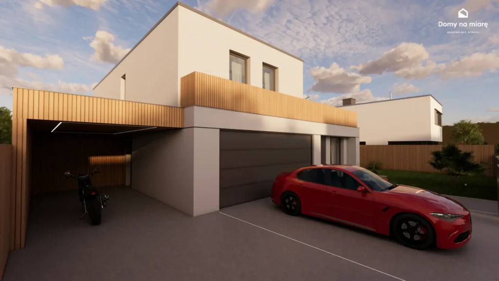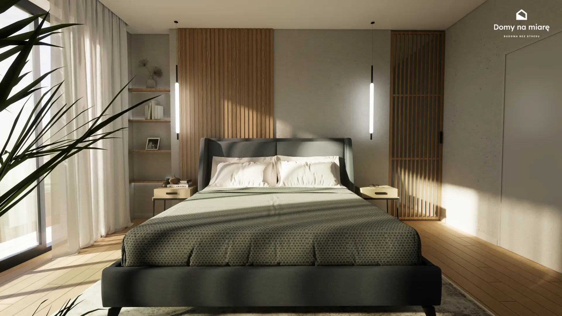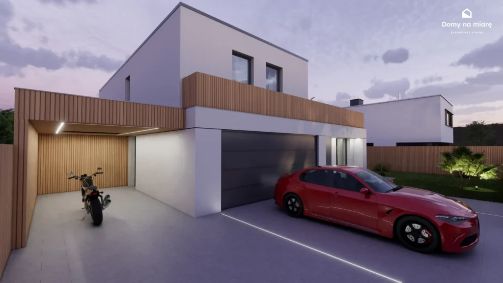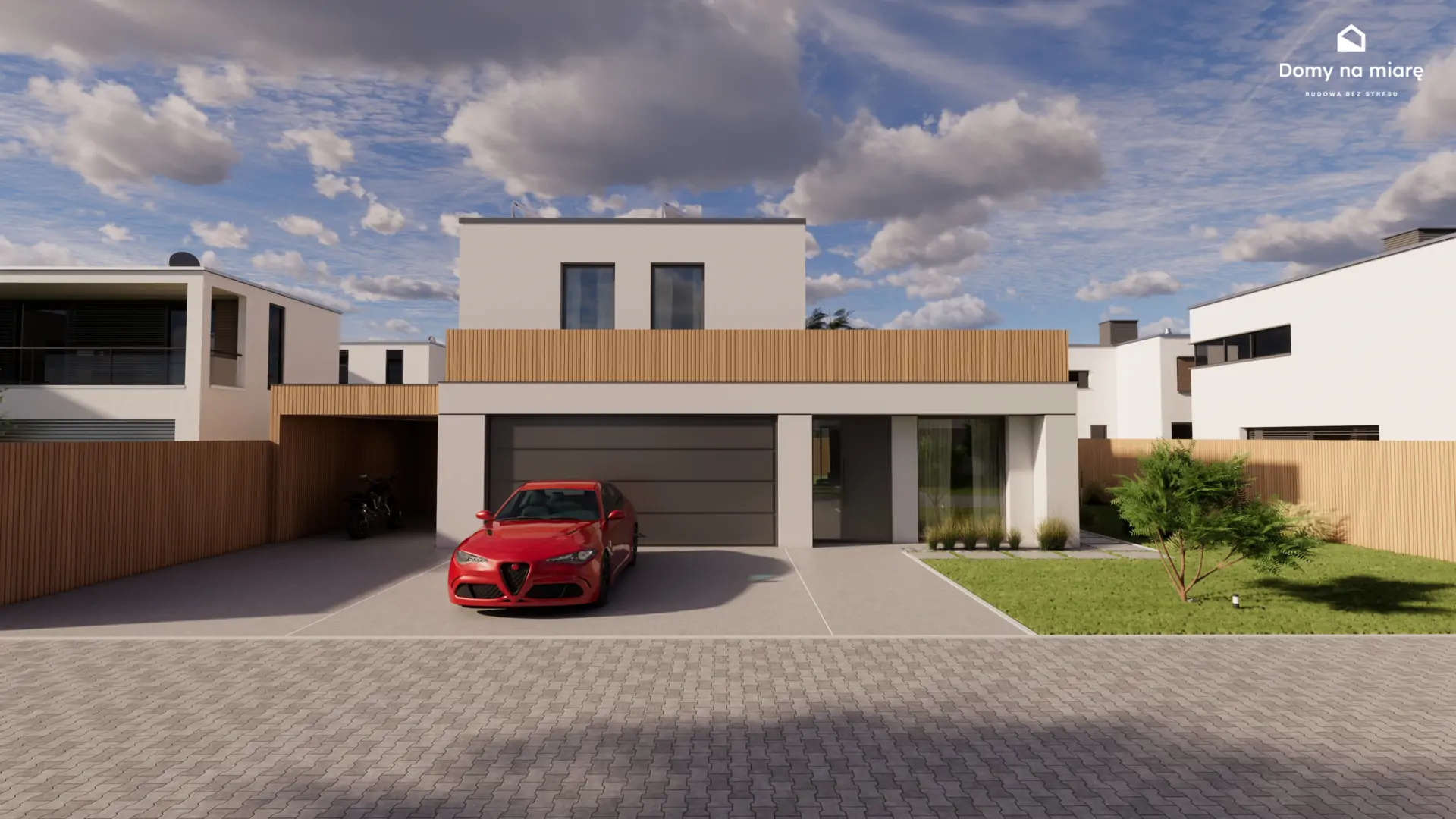 To dom z bardzo jasnym podziałem na strefę dzienną oraz nocną z osobnym wydzielonym apartamentem, w którym znajduje się główna sypialnia z łazienką i przestronną garderobą. Centralną część domu stanowi salon z częściowo wydzieloną kuchnią i jadalnią. Z kuchni prowadzi przejście do części wypoczynkowej, gdzie znajduje się jacuzzi zewnętrzne. Duże przeszklenia zapewniają doskonałe doświetlenie oraz widok na ogród. W domu zaprojektowano 2 stanowiskowy garaż, a na piętrze dodatkowy taras z wyjściem z sypialni.