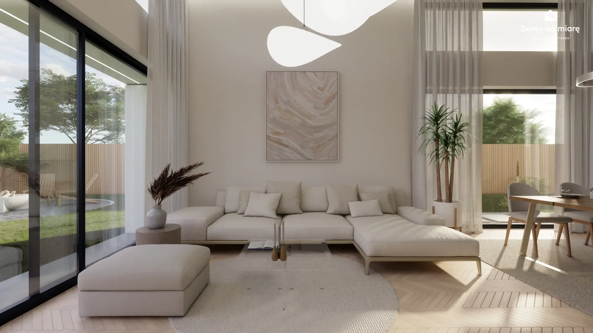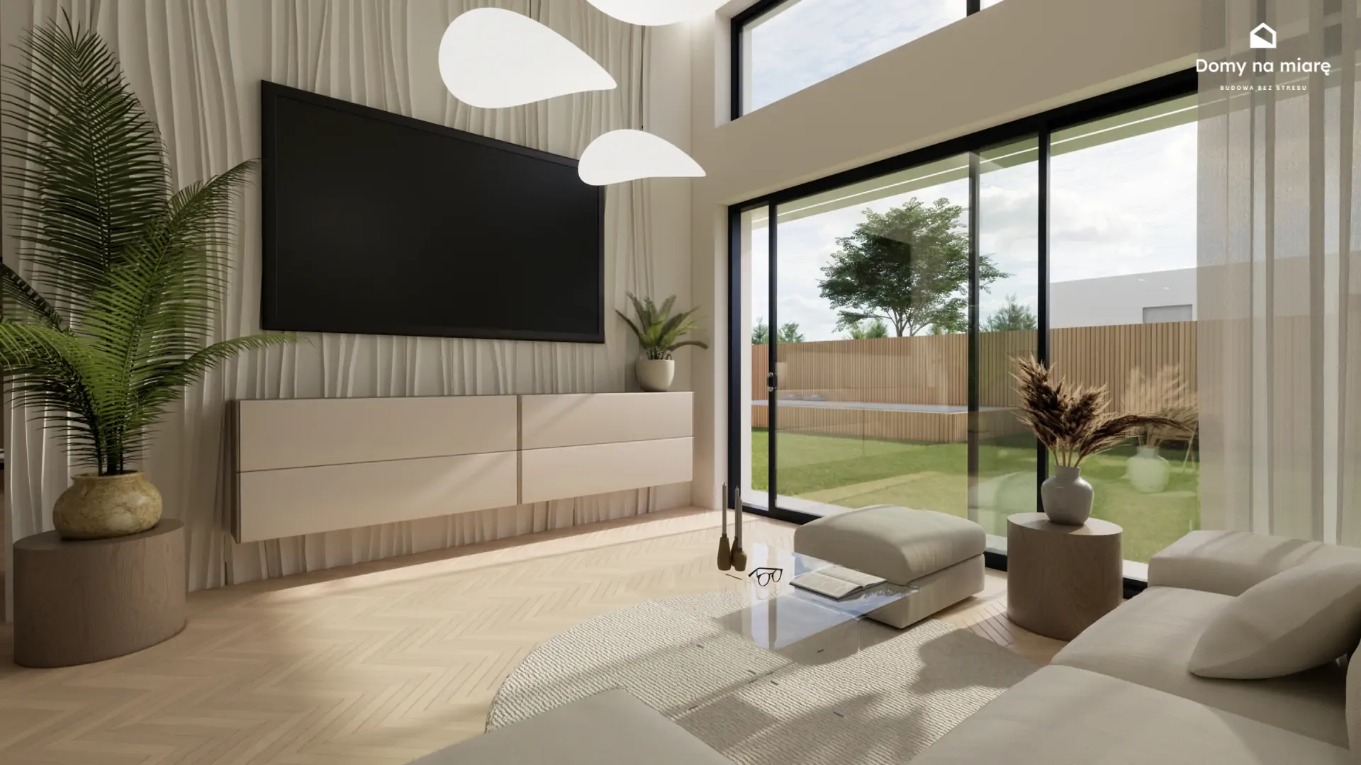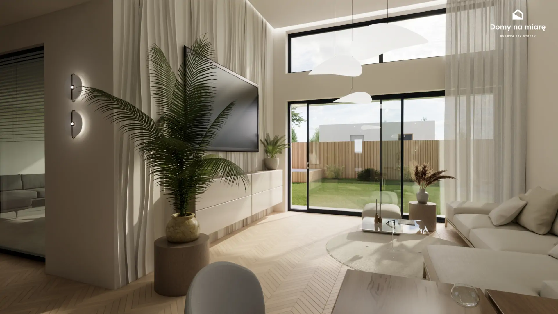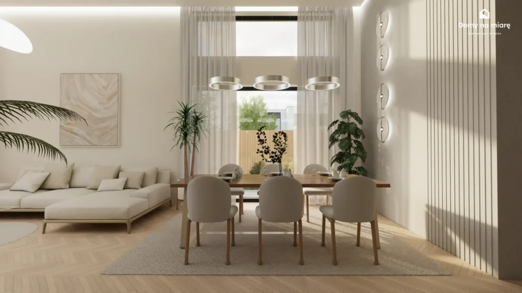Przestronny salon z podwyższonym sufitem i widokiem na ogród – idealne miejsce na wspólne chwile z najbliższymi.