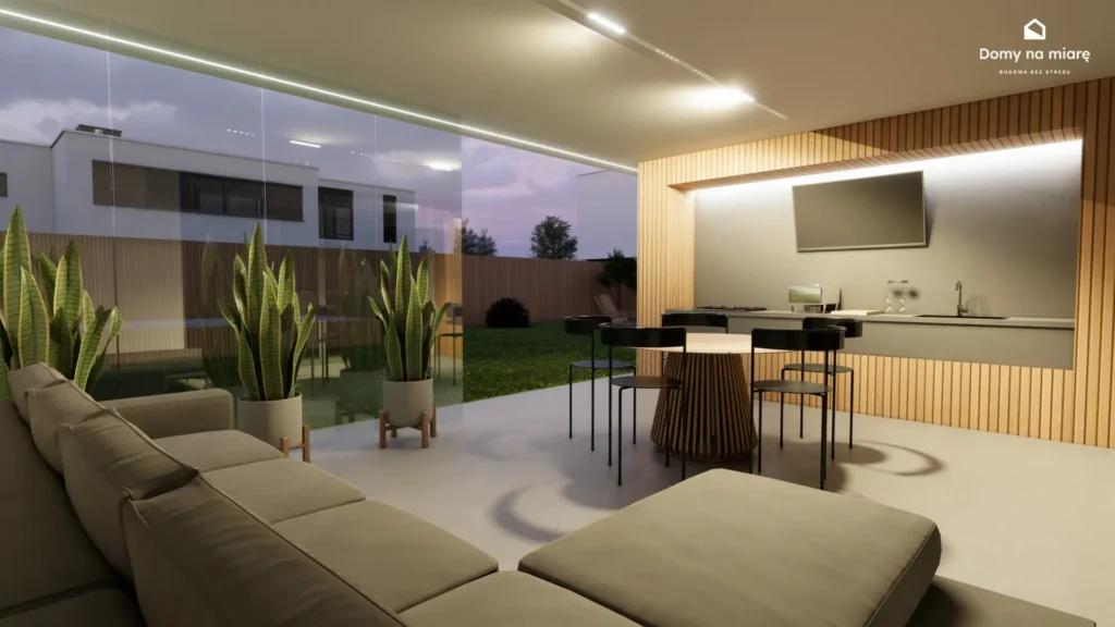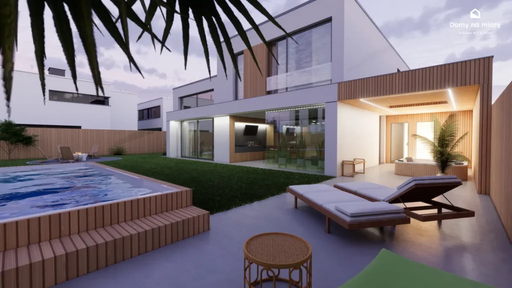 Właściciela marzyli o miejscu do relaksu – jacuzzi i saunie, stworzyliśmy taką przestrzeń pod zadaszeniem, dla większego komfortu. Dodatkowo ogród zimowy z letnią kuchnią oraz basen. Pełnia relaksu we własnym domu.