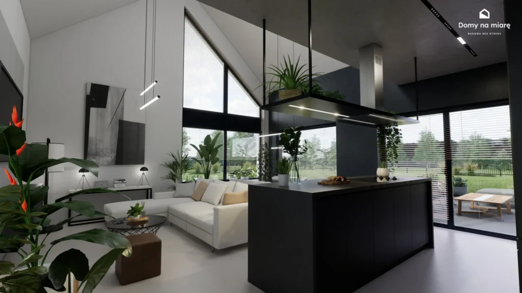Przestronny salon z wysokim sufitem i widokiem na ogród – idealne miejsce na wspólne chwile z najbliższymi.