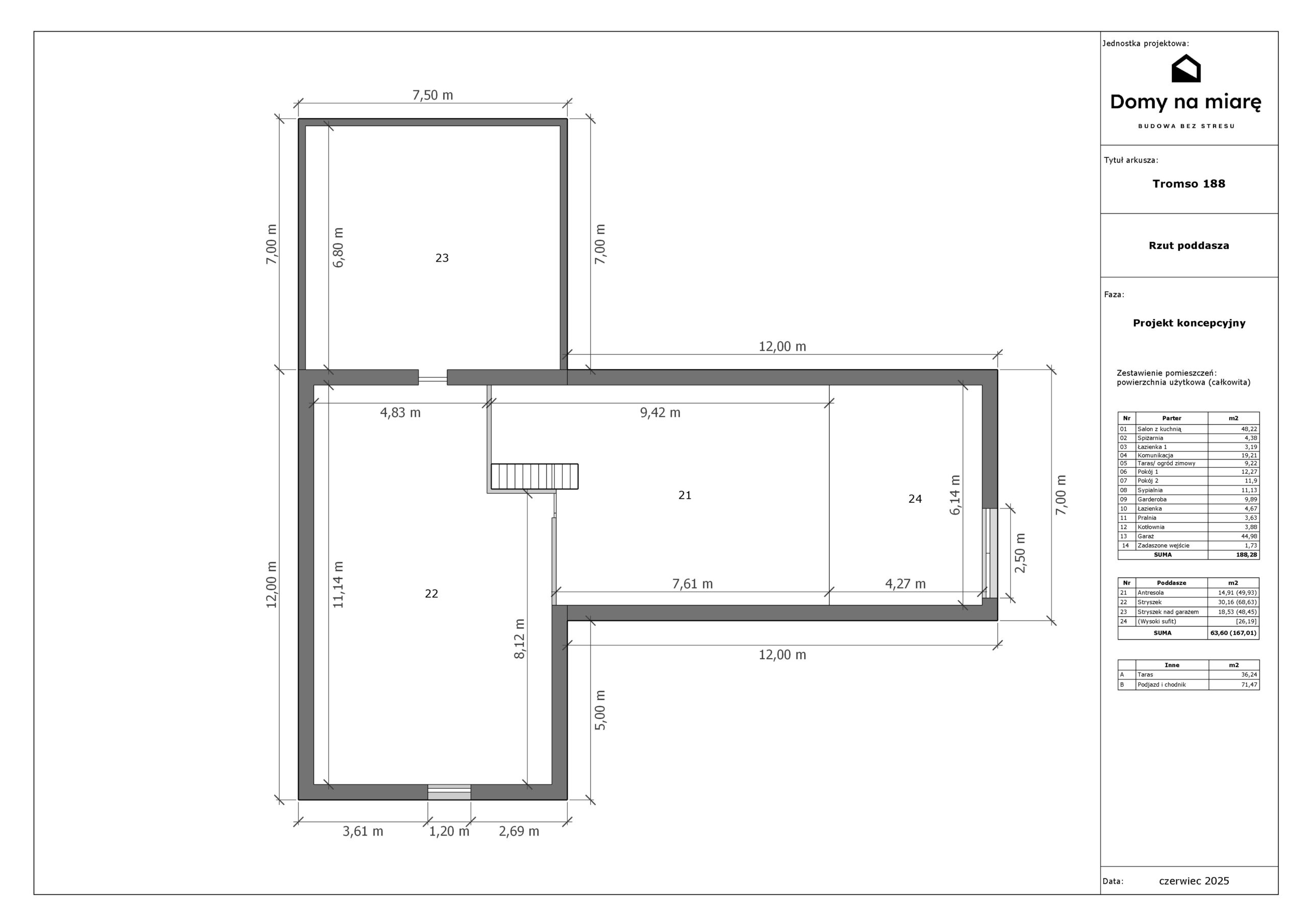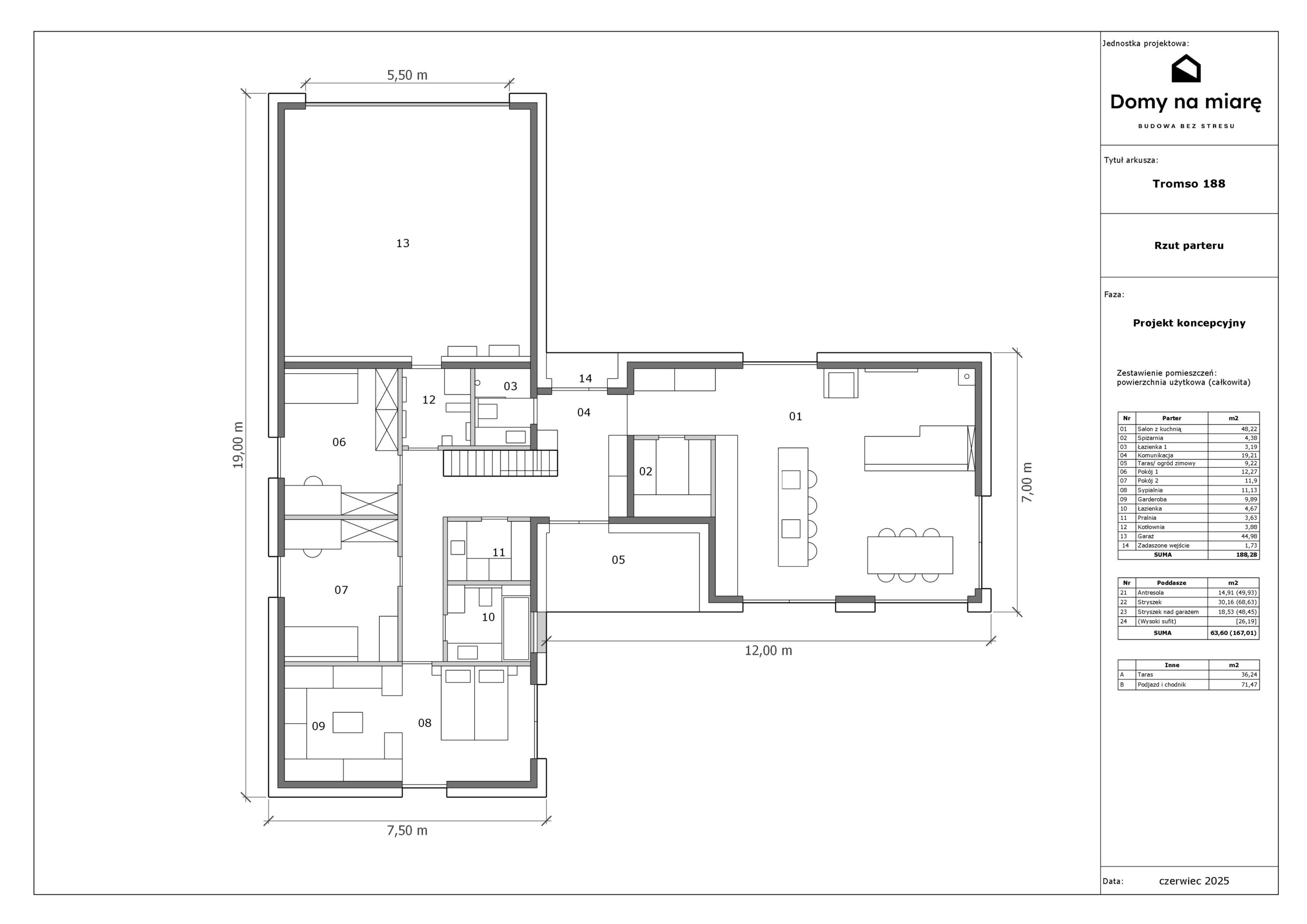 Znajdziesz tu szczegółowe informacje o wymiarach zewnętrznych budynku i wielkości jego pomieszczeń.