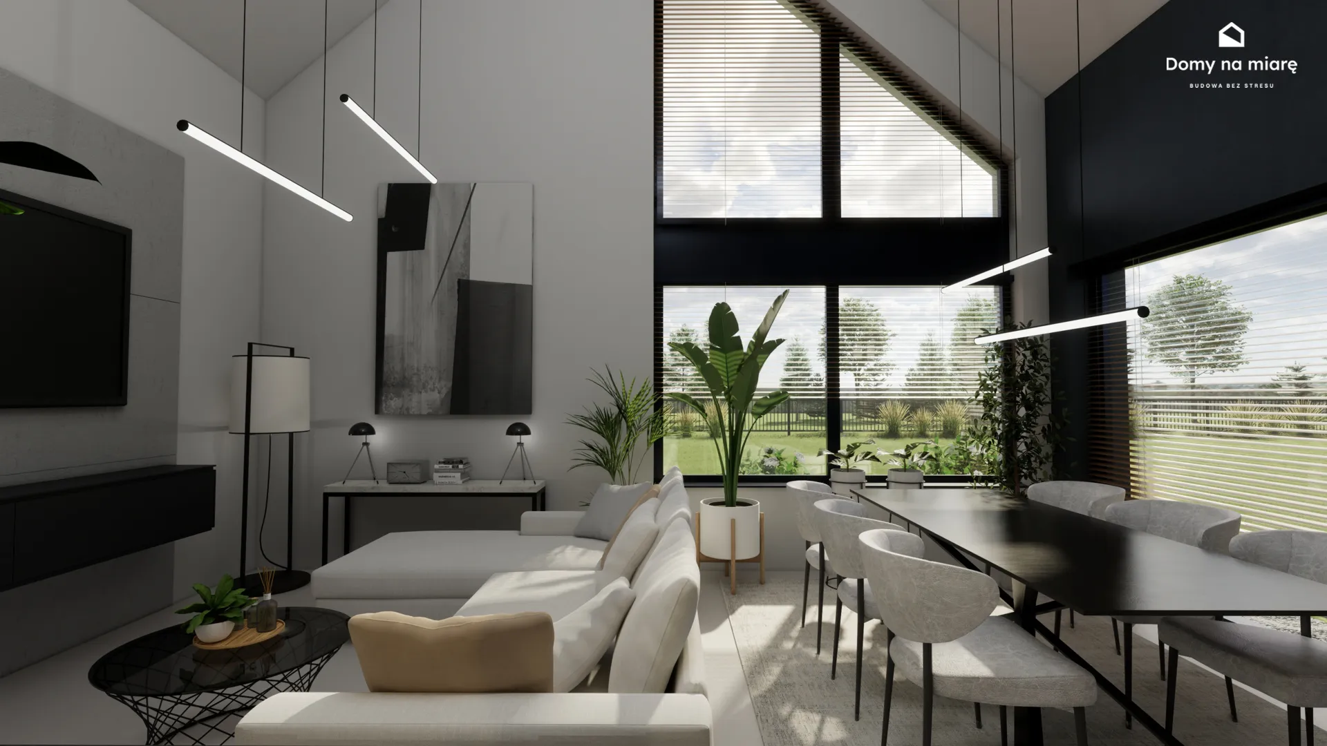 Przestronny salon z wysokim sufitem i widokiem na ogród – idealne miejsce na wspólne chwile z najbliższymi.